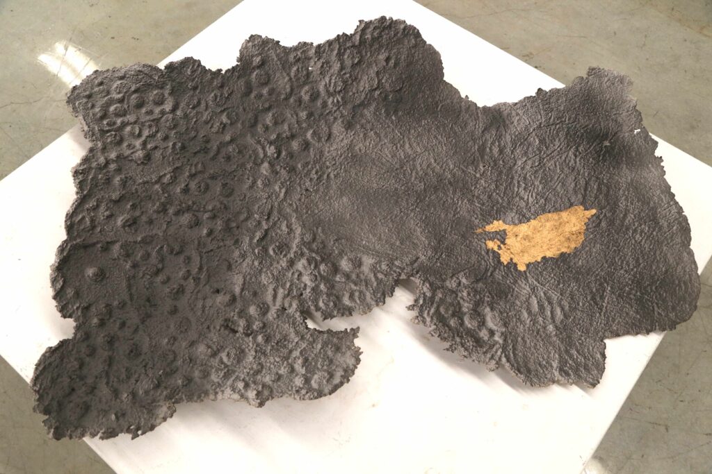 Looking down at this piece, it resembles a topography. The warped, rough material reminds of wind-swept ice formations or the surface of the Moon, bending upwards like at the foot of a mountain. Perhaps the gold is a territory, a golden land, or a promised land. The personal interpretations that arise is inevitably what is captured.